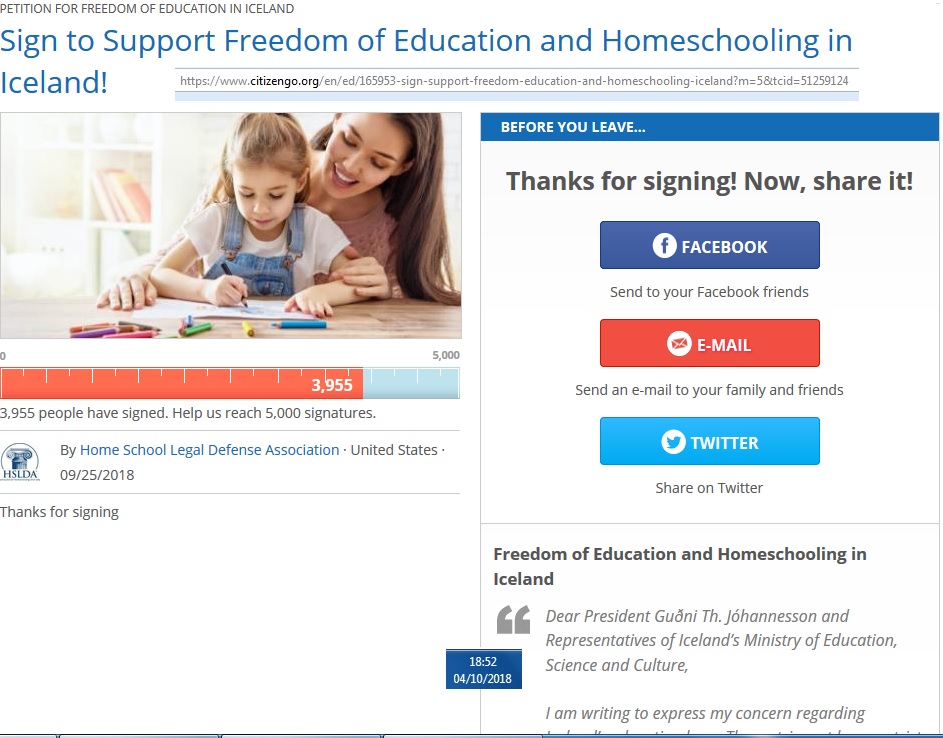 I am writing to express my concern regarding Iceland’s education laws. These stringent laws restrict freedom of education and prevent many families from homeschooling.